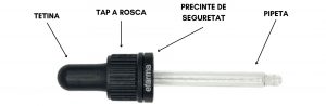 - Pipeta: Habitualment de vidre transparent, amb diferents llargs segons la capacitat del flascó. Es pot afegir serigrafia per marcar la dosificació.
