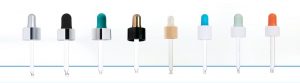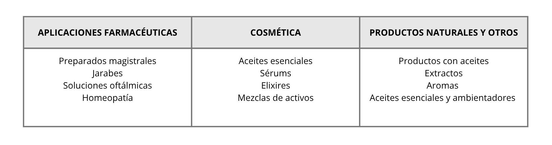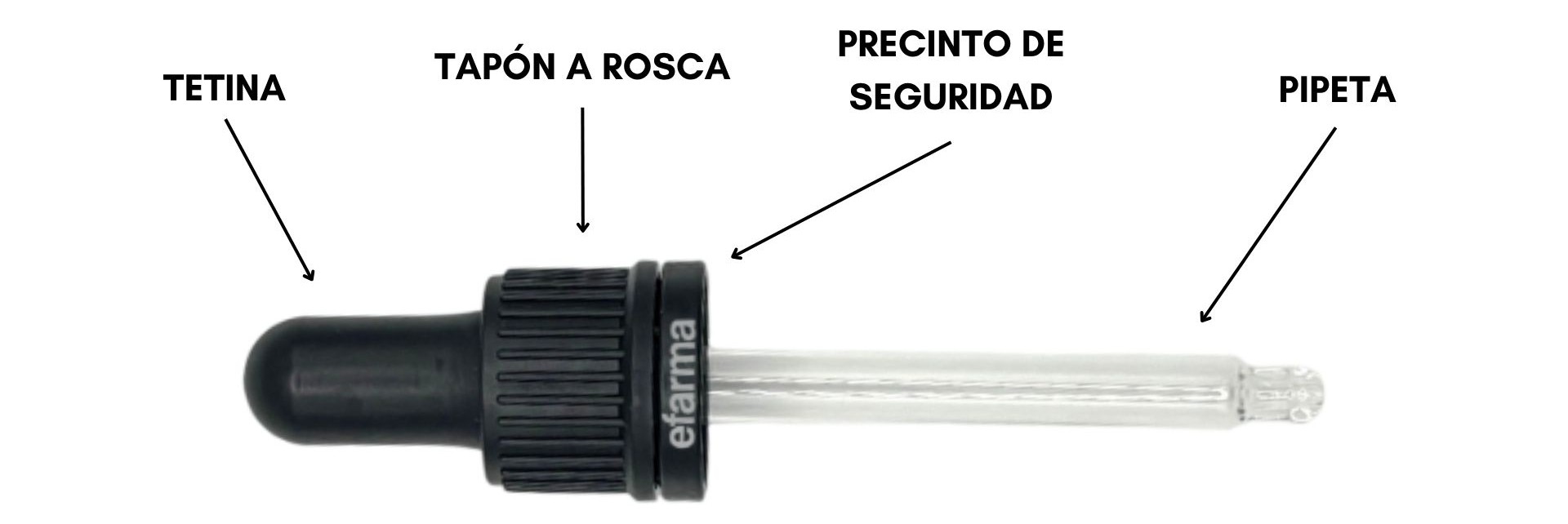 - Pipeta: Habitualmente de cristal transparente, con distintos largos según la capacidad del frasco. Puede añadirse serigrafía para marcar la dosificación.