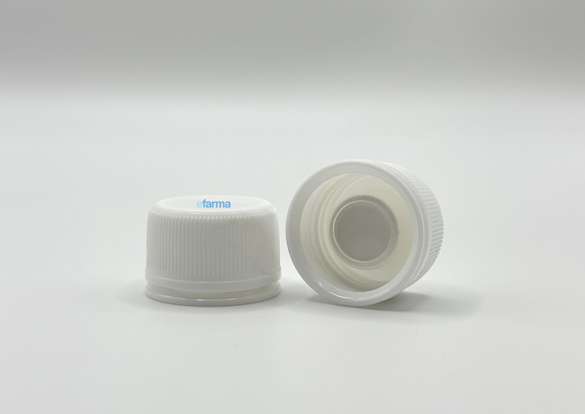Tapón rosca con precinto de seguridad Pilfer 28 y sistema desecante con silica gel. Color blanco. Apto para vidrio.
