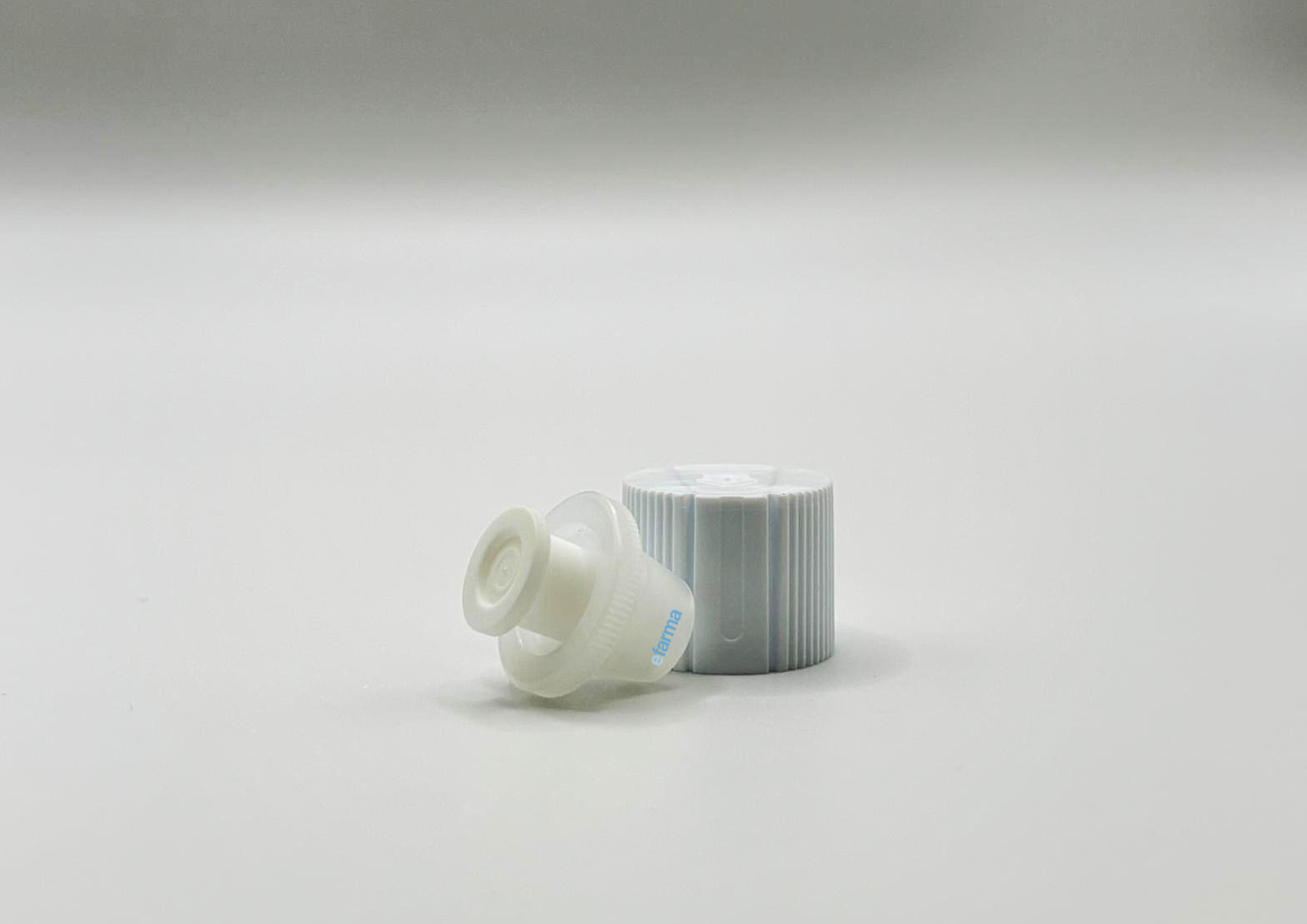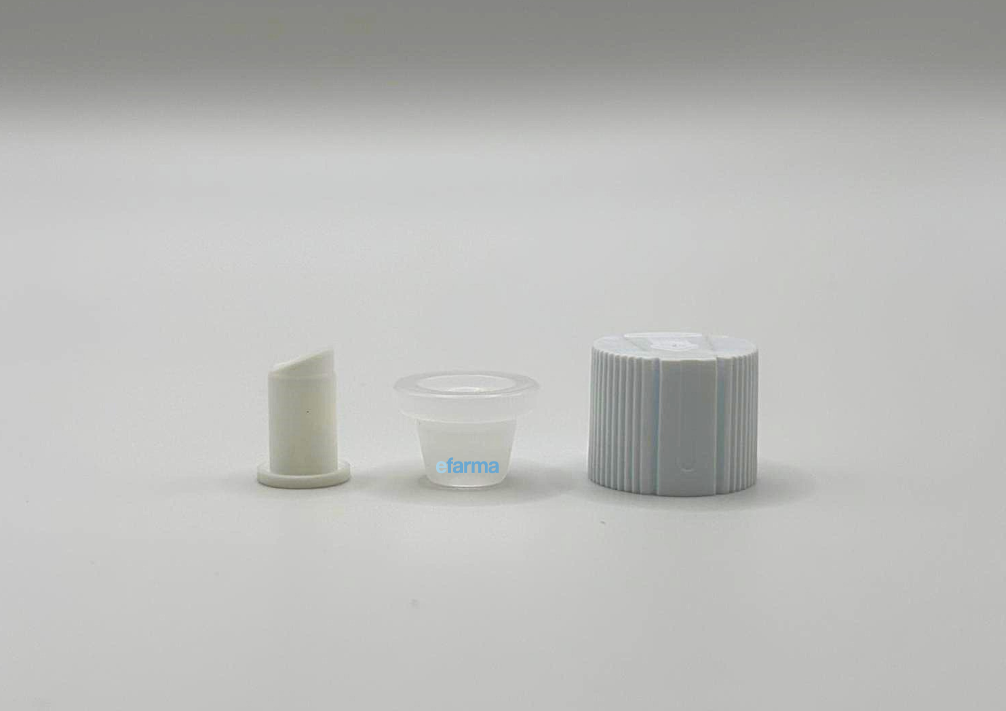 Apto para uso farmacéutico y cosmético. Tapón compuesto por tres piezas que permite mantener el producto acuoso separado del activo hasta la apertura del producto. Se trata de un sistema monodosis manual.
