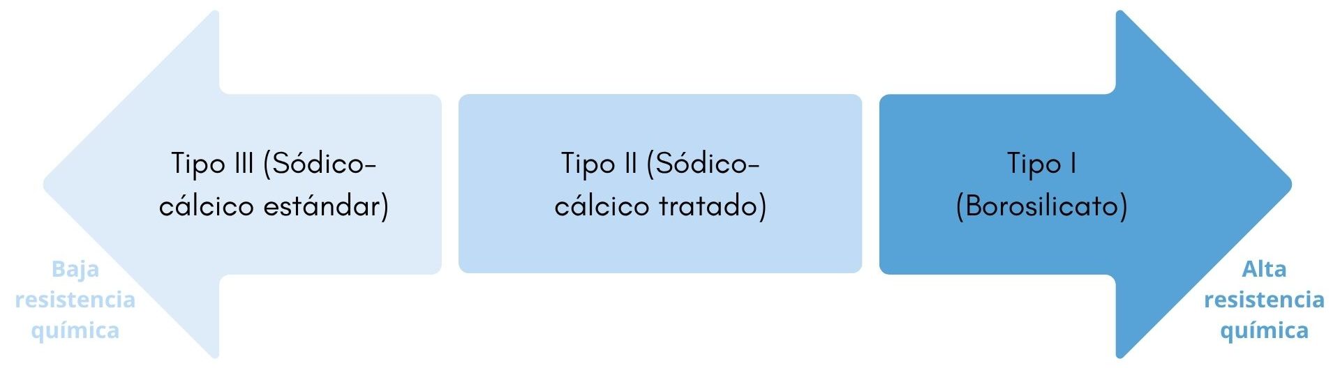 Tipo II (Sódico-cálcico tratado): Tratamiento superficial que mejora la resistencia hidrolítica. Económico pero seguro. Su uso se recomienda para viales o frascos con soluciones ácidas o neutras, preparaciones intravenosas con pH<7.
