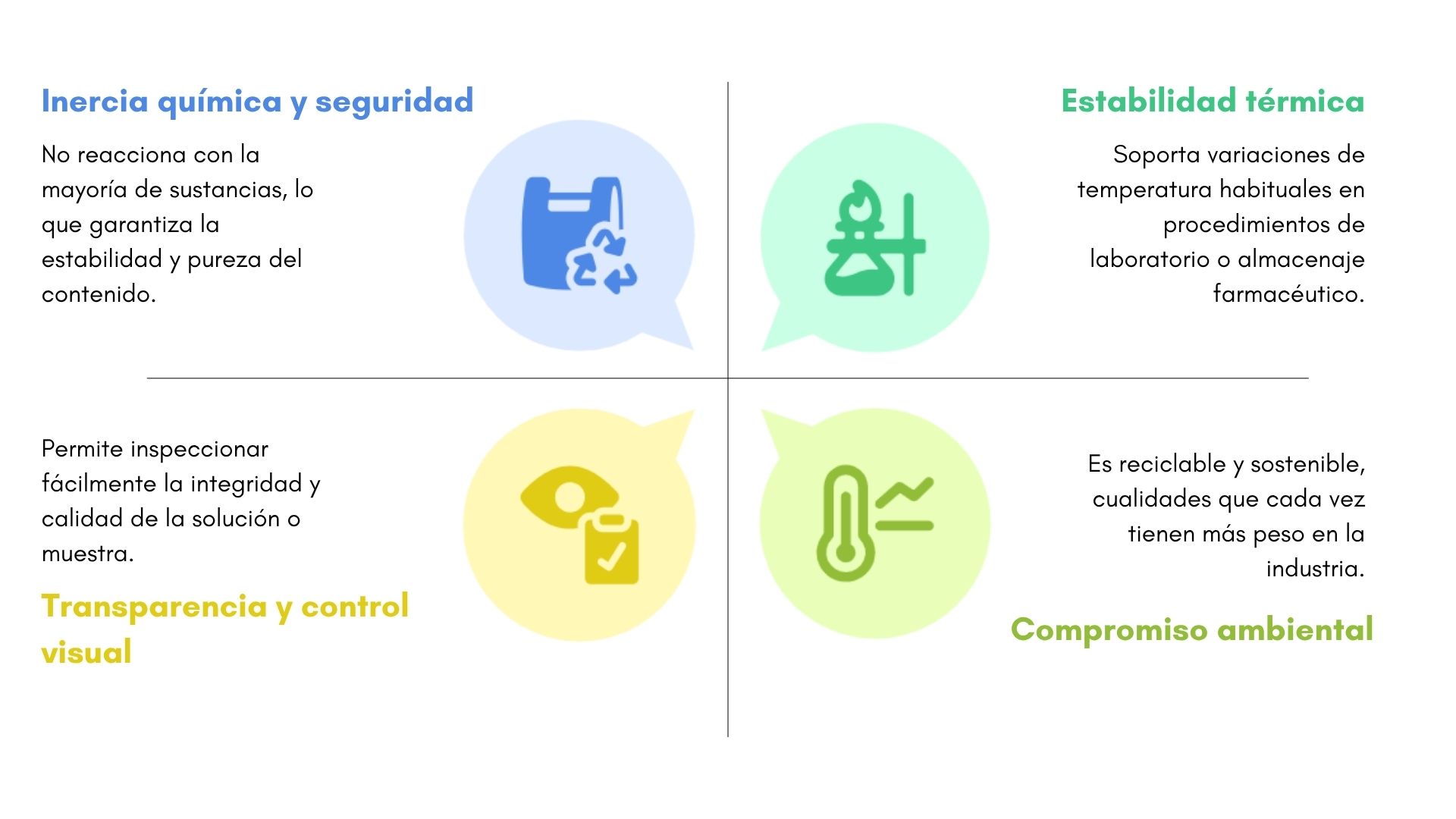 Tipo I (Borosilicato): Máxima resistencia química, alta estabilidad y soporta choques térmicos. Su uso es muy amplio debido a su seguridad, aunque los usos más habituales son para viales con soluciones inyectables, fármacos sensibles o reactivos críticos, entre otros.