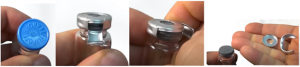 Flip Off: Tras retirar el disco de plástico, se expone la zona central del tapón de goma para su extracción con aguja, mientras el resto del aluminio permanece en el vial, reduciendo el riesgo de contaminación.